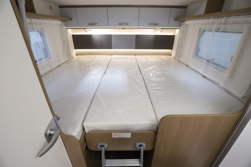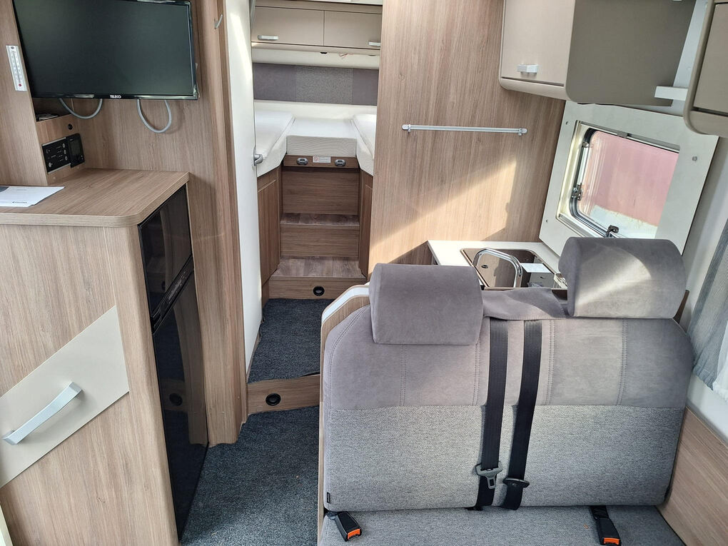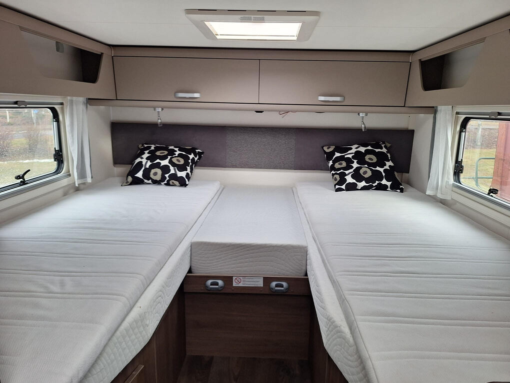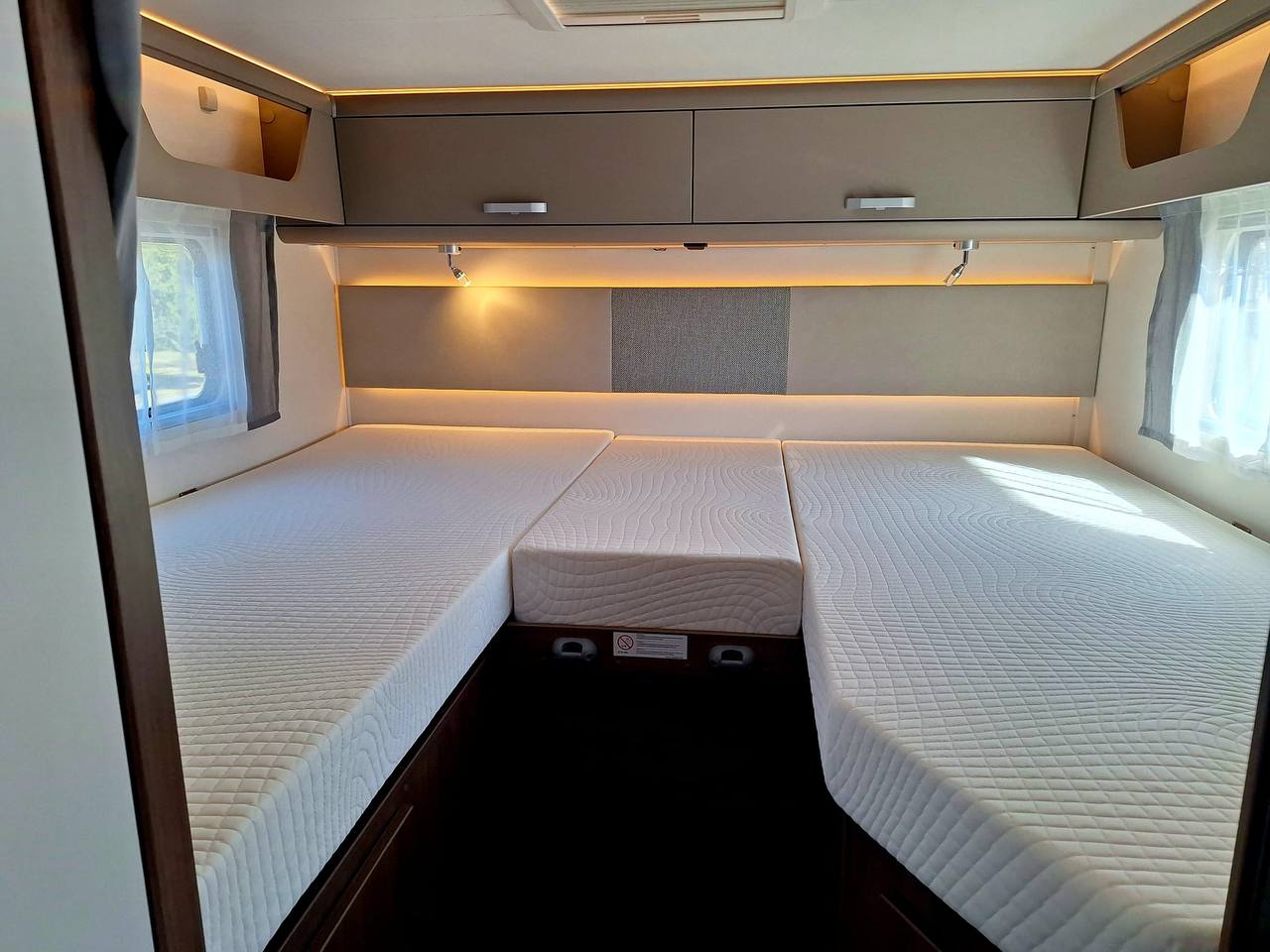 Rekisteröimätön Dethleffs Just 90 T 7052 EB, jossa edessä tilava ruokailuryhmä ja sähkötoiminen laskuvuode, keskellä tilava keittiö suurella jääkaapilla. Takana erilliset suihku- ja wc-tilat sekä korkeat erillisvuoteet.