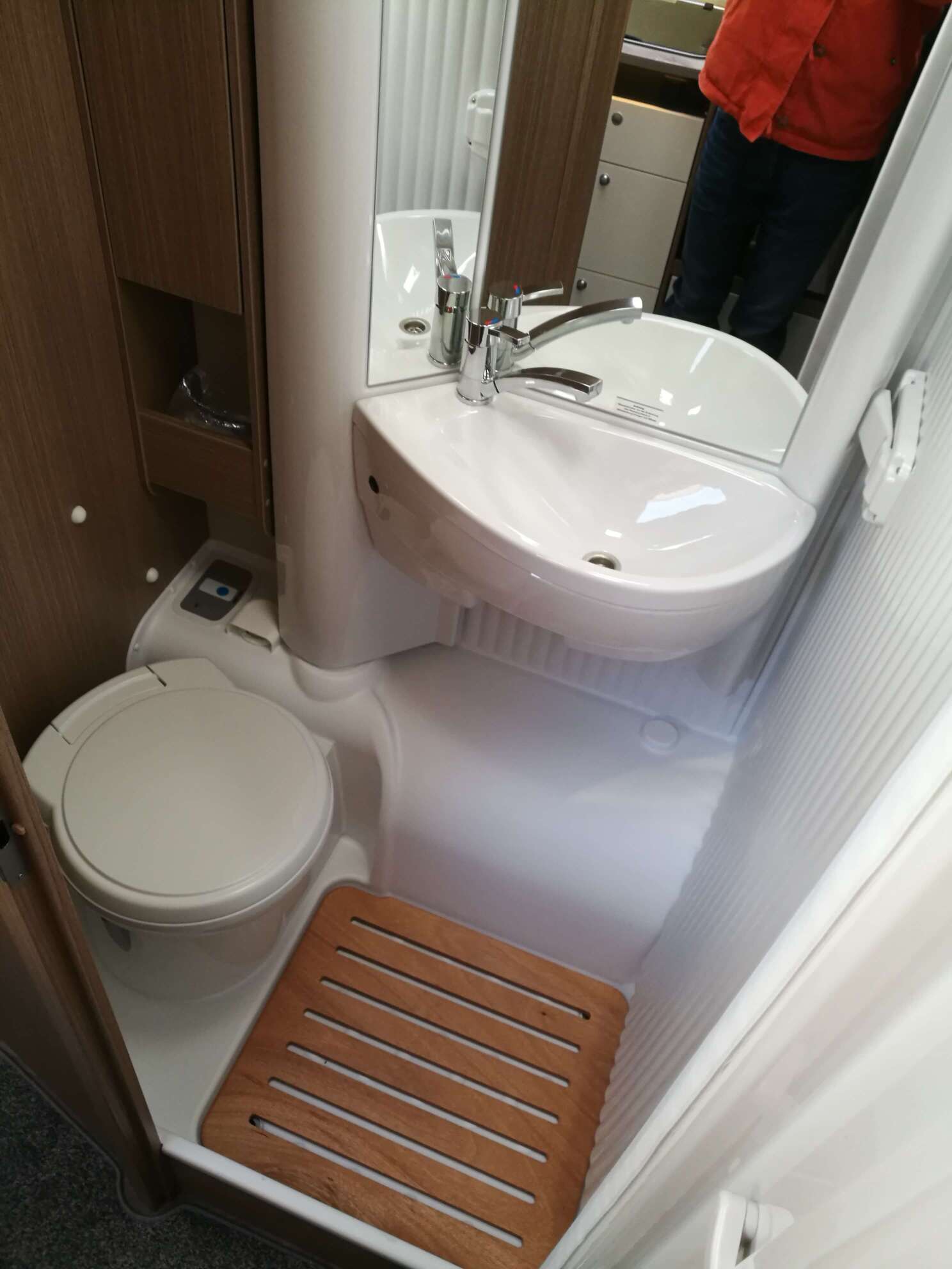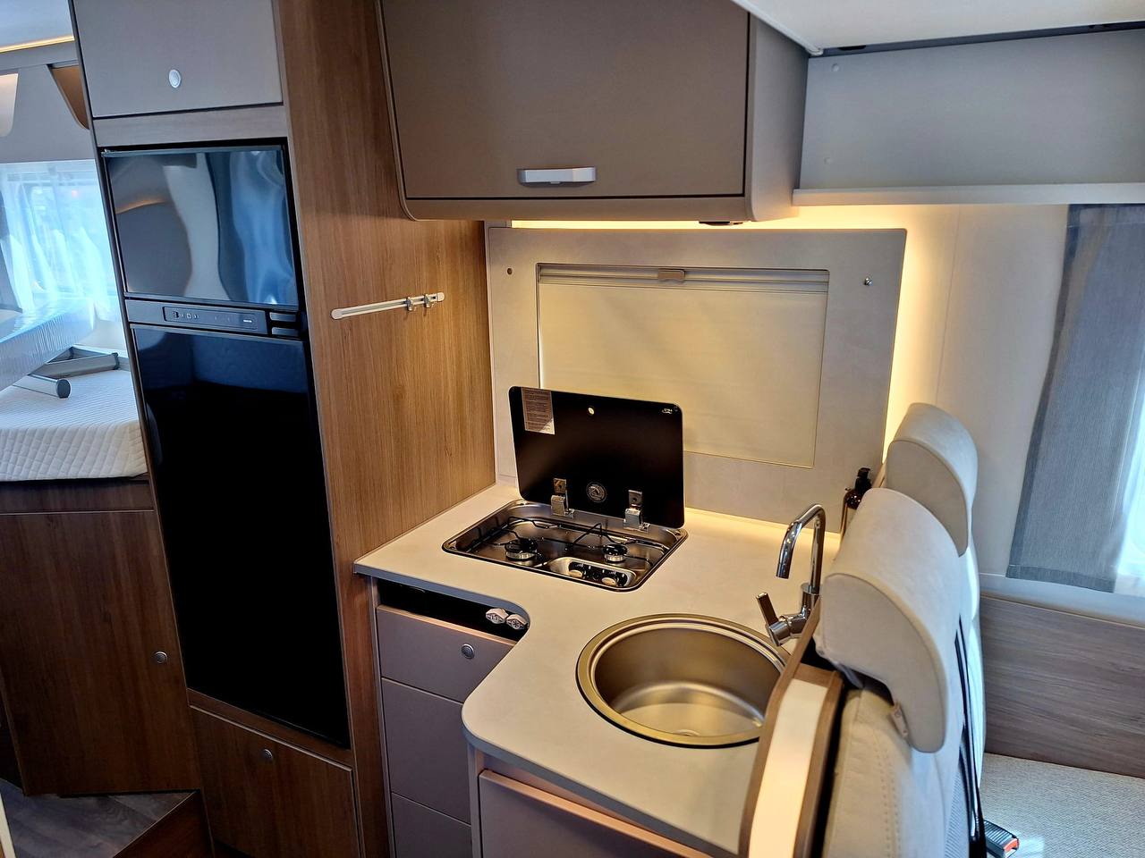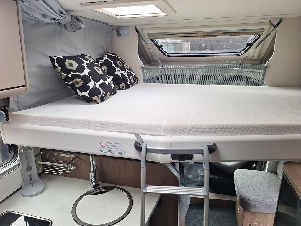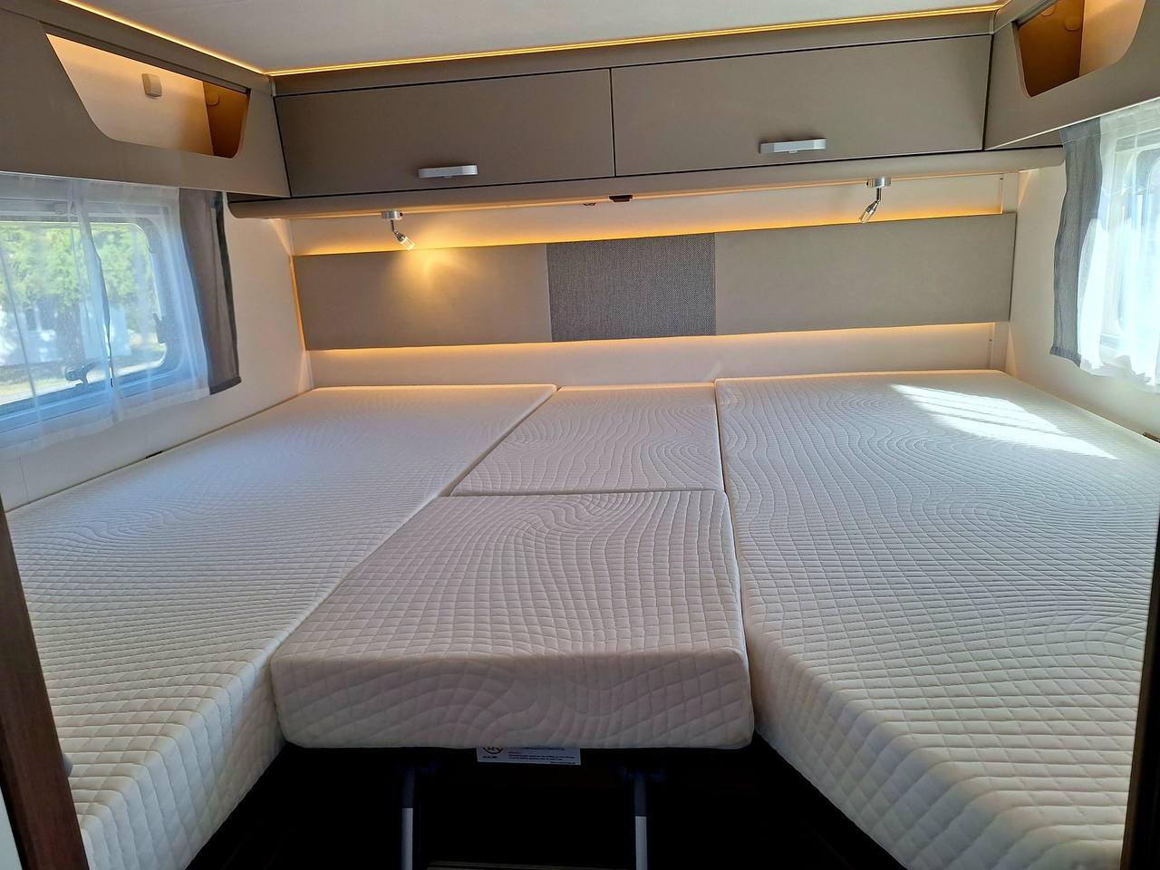 Rekisteröimätön Dethleffs Just 90 T 7052 EB, jossa edessä tilava ruokailuryhmä ja sähkötoiminen laskuvuode, keskellä tilava keittiö suurella jääkaapilla. Takana erilliset suihku- ja wc-tilat sekä korkeat erillisvuoteet.